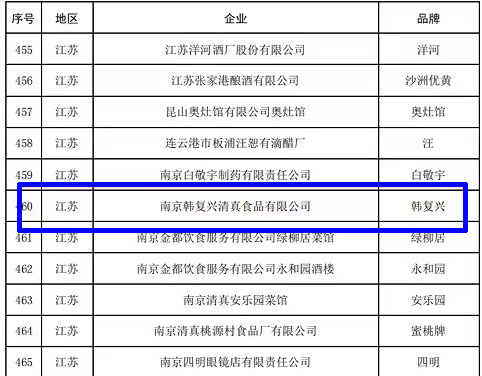 南京韓復興清真食品有限公司的品牌“韓復興”是2006年被國家商務部認定為第一批的“中華老字號”,再到今年,經過國家商務部復核認定,繼續位列其中!(見下圖460號)