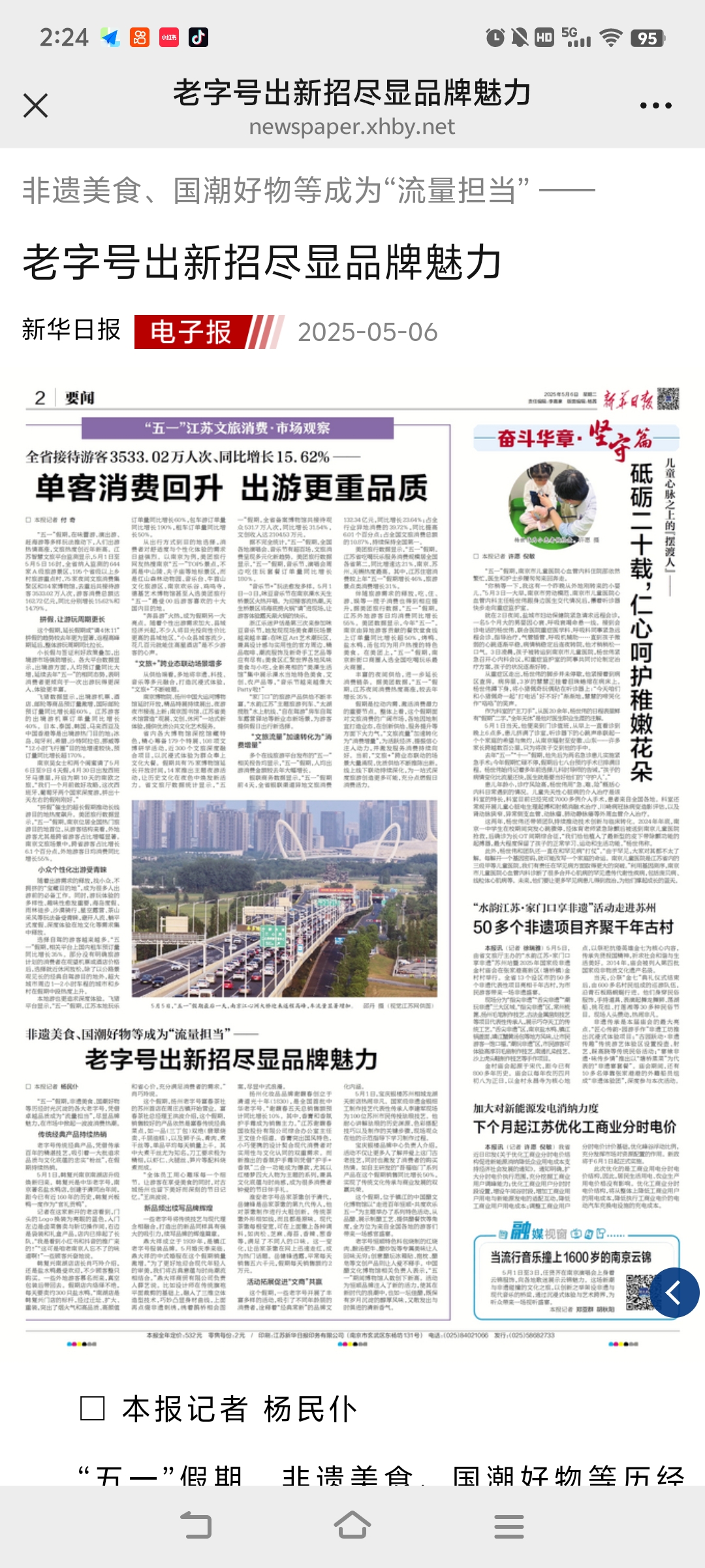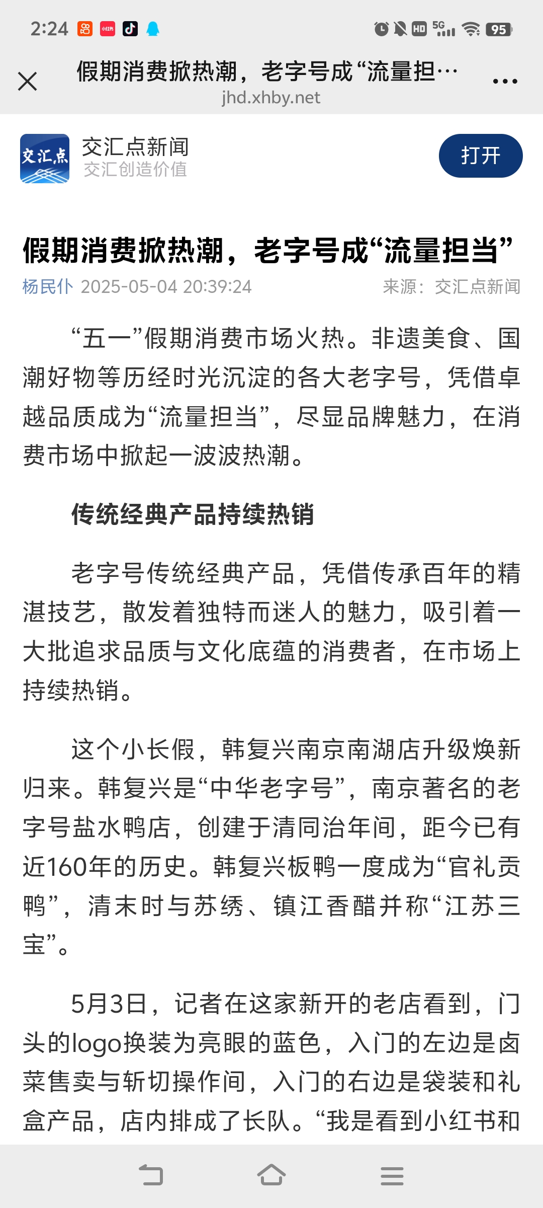 5月4日,《交匯點新聞》以"假期消費掀熱潮,老字號成'流量擔當'"為題,率先捕捉到這股消費新浪潮;5月5日,《學習強國》同樣被這份老字號的魅力所打動;5月6日,《新華日報》更是用"非遺美食、國潮好物等成為'流量擔當'"的生動描述,展現了韓復興如何將傳統與時尚完美融合。